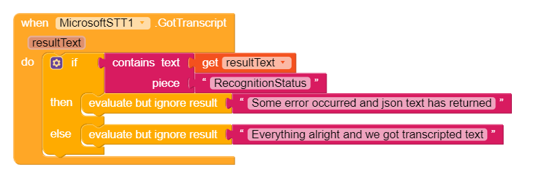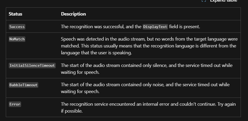 Note: resultText parameter will be json text in case of error. Check if there is RecognitionStatus in result or not. If it is present then an error occurred in backend. In this case, its value can be NoMatch , InitialSilenceTimeout , BabbleTimeout or Error