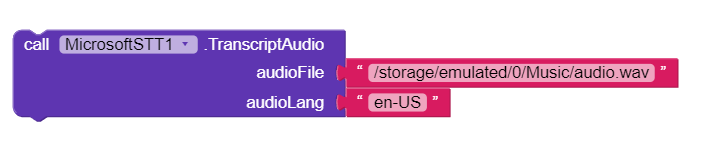 | TranscriptAudio | Get text from audio (wav) fileaudioFile | textaudioLang | text |